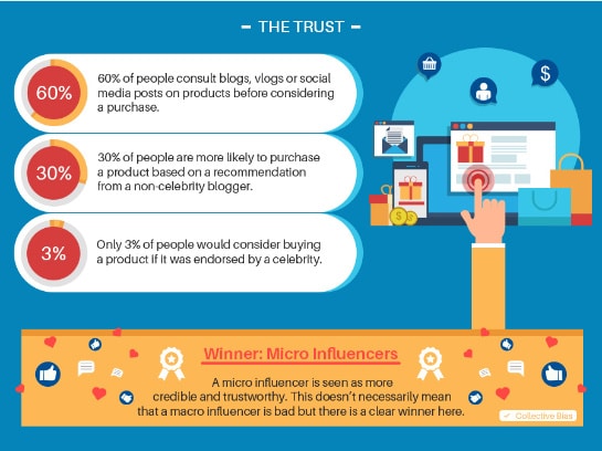 Micro-influencers engage daily with their followers on an intimate level. Followers are considered friends and are treated as such. In return followers trust that a micro-influencer will be honest and upfront about any products they review or endorse. Friends influence 81% of consumers’ purchasing decisions on social media and if micro-influencers consider their followers’ friends and vice versa, no wonder 82% of consumers say they would follow a recommendation by a micro-influencer as opposed to a mega-influencer.